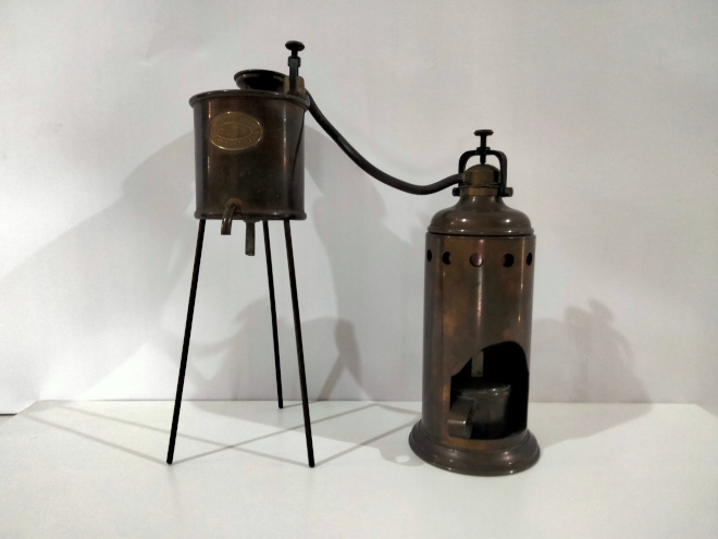 Destilador formado por un mechero que calienta un deposito con agua y otro recipiente que recoge el vapor destilado.