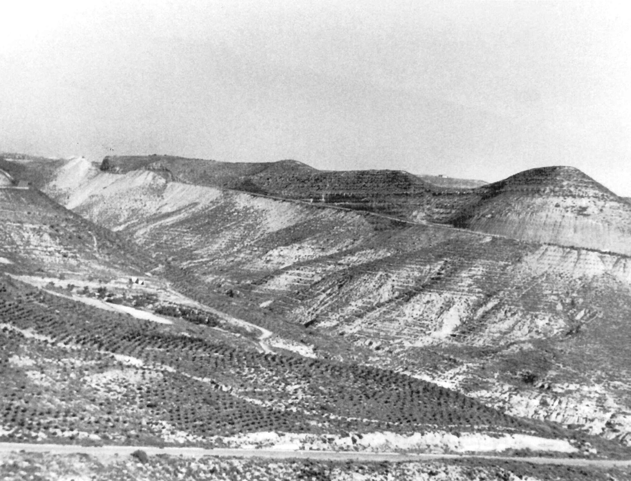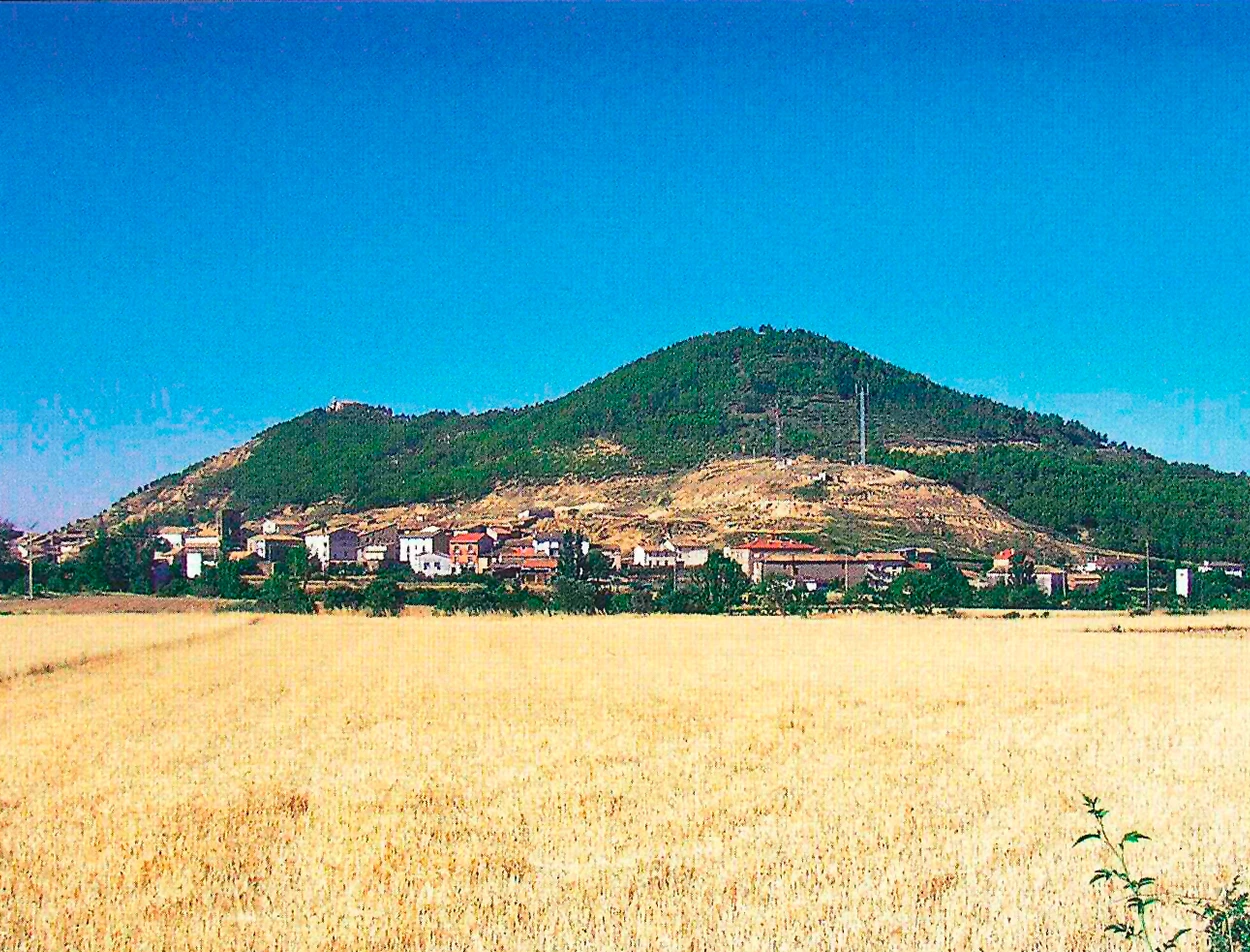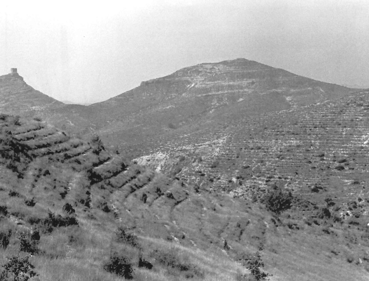 Vista del monte HU-1.128 (UP-375)., Cuartos de San Pablo, y el pueblo de Ayerbe, monte de 230 ha repoblado por hoyos y fajas con los bueyes en 1964-66 con Pinus halepensis