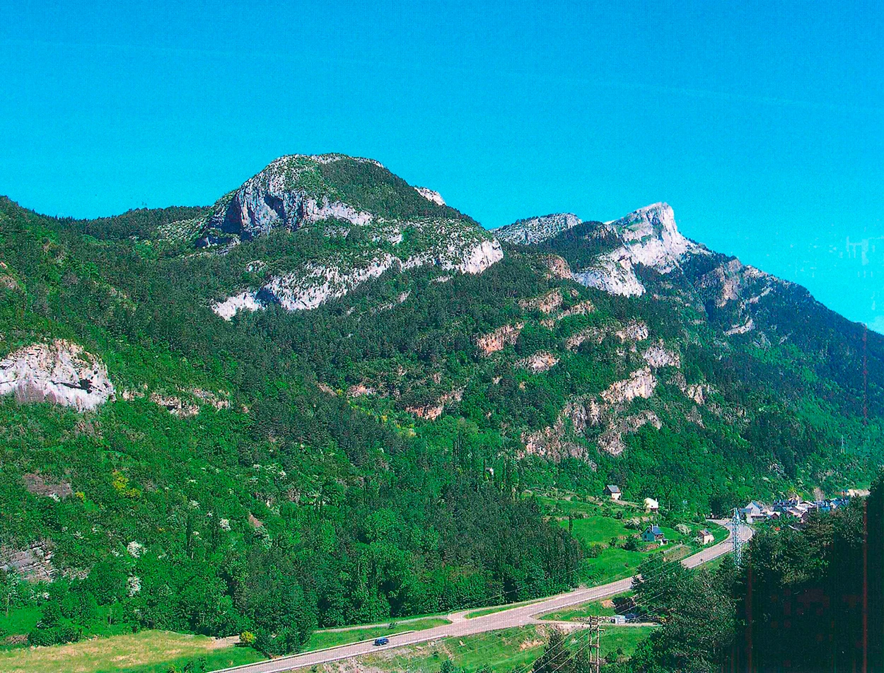 Vista aérea del Monte Cájol, HU- 1.142 de 282 ha, al fondo monte Semolué, HU-1.143, adquiridos ambos en 1964. Al fondo a la izquierda el estrecho de Jánovas.